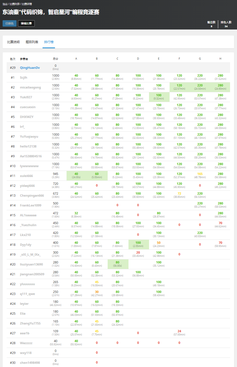 评分规则:比赛结束后按总得分及总用时进行排名(罚时制)。
